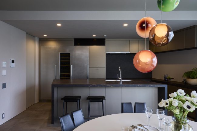 フロア全体を使ったLDKはオーダーキッチンと造作家具でオリジナルなスペースを作り、こだわりを持って集めコーディネートした家具、ペンダント照明を
