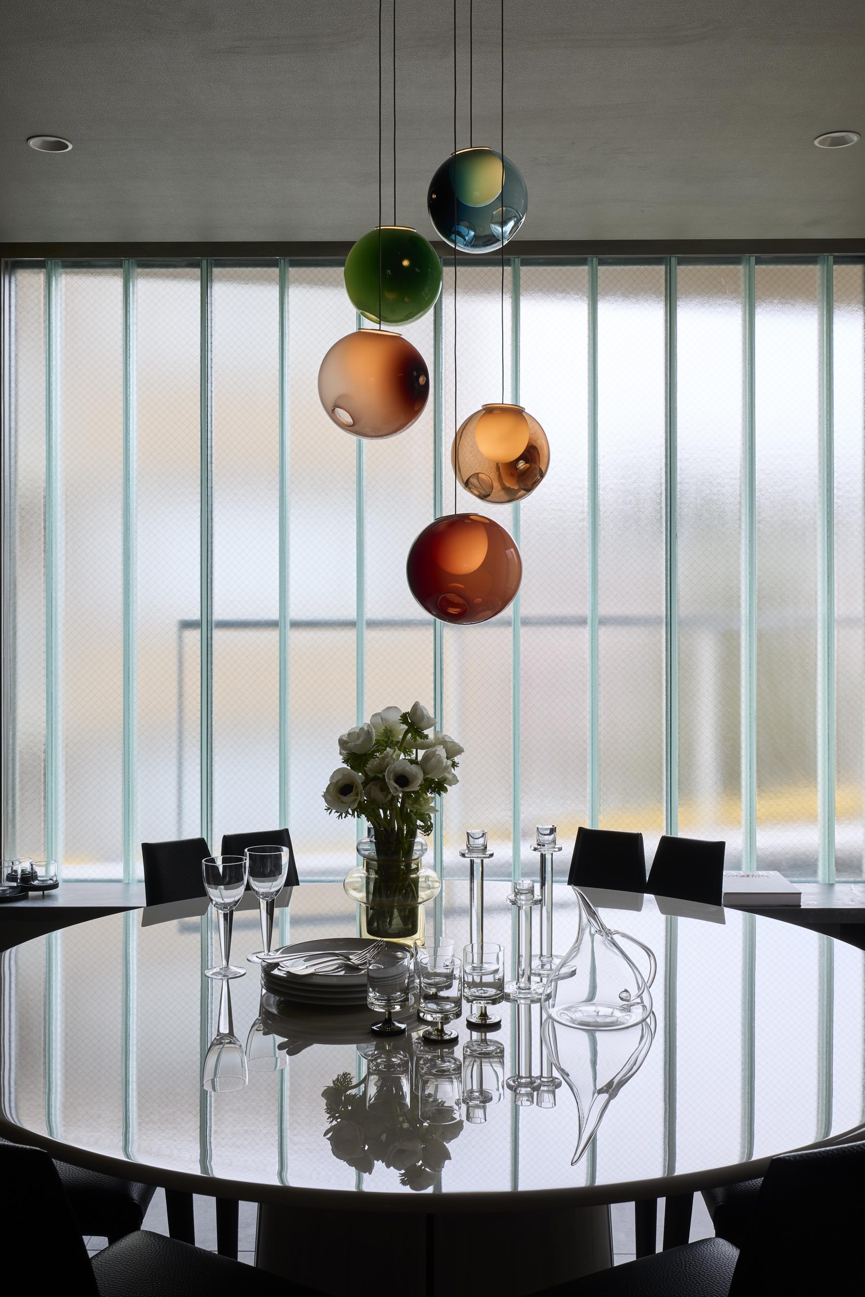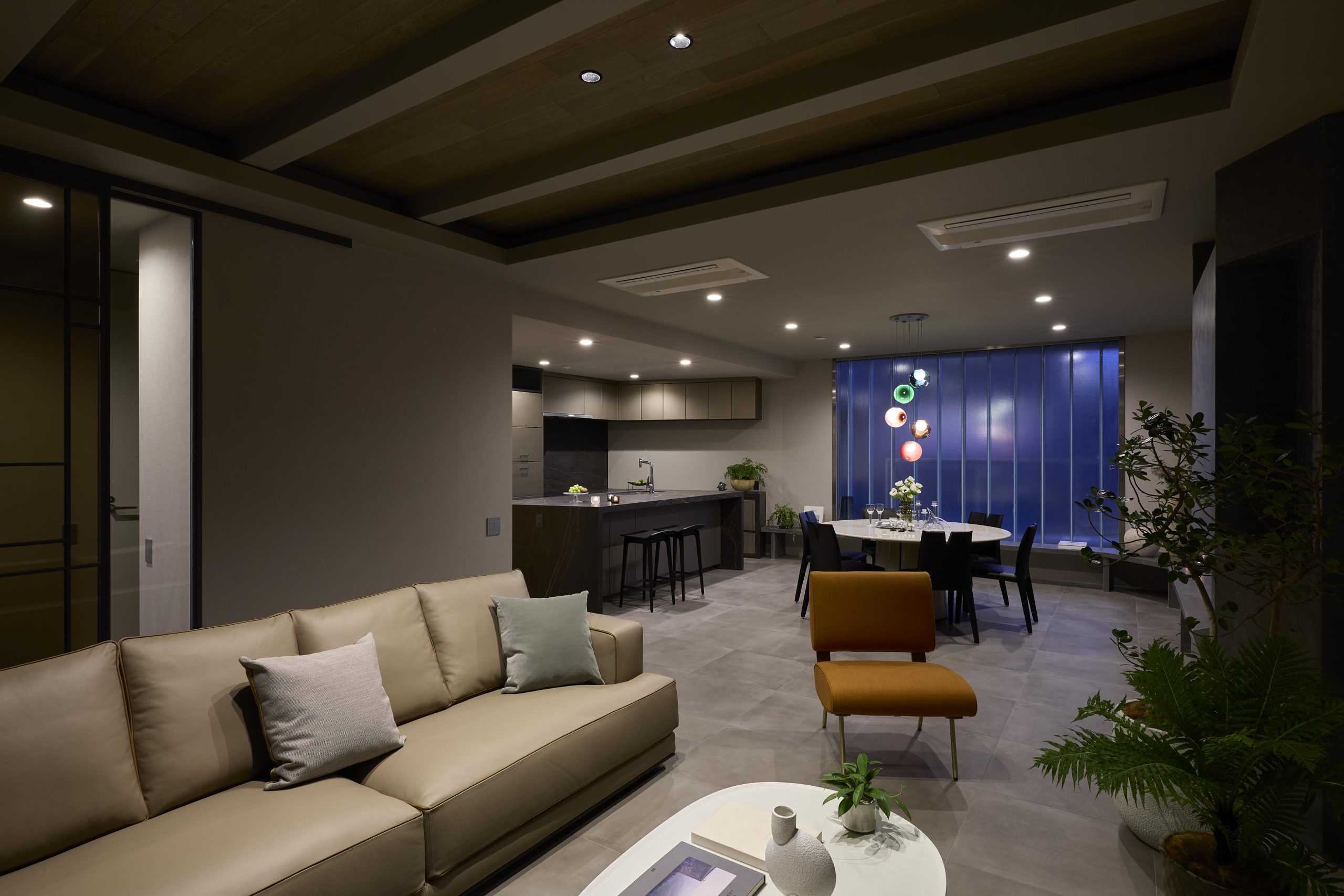 フロア全体を使ったLDKはオーダーキッチンと造作家具でオリジナルなスペースを作り、こだわりを持って集めコーディネートした家具、ペンダント照明を